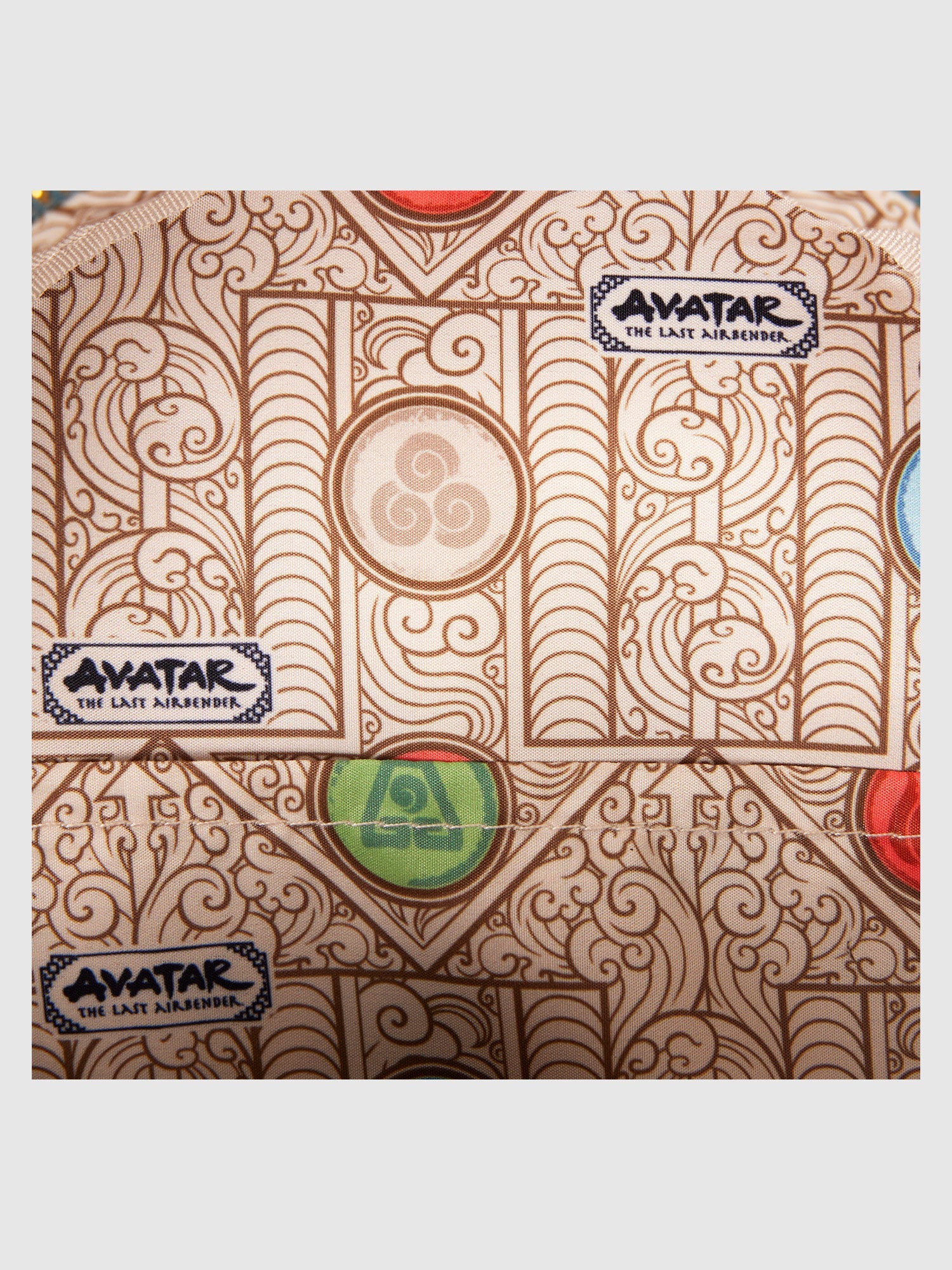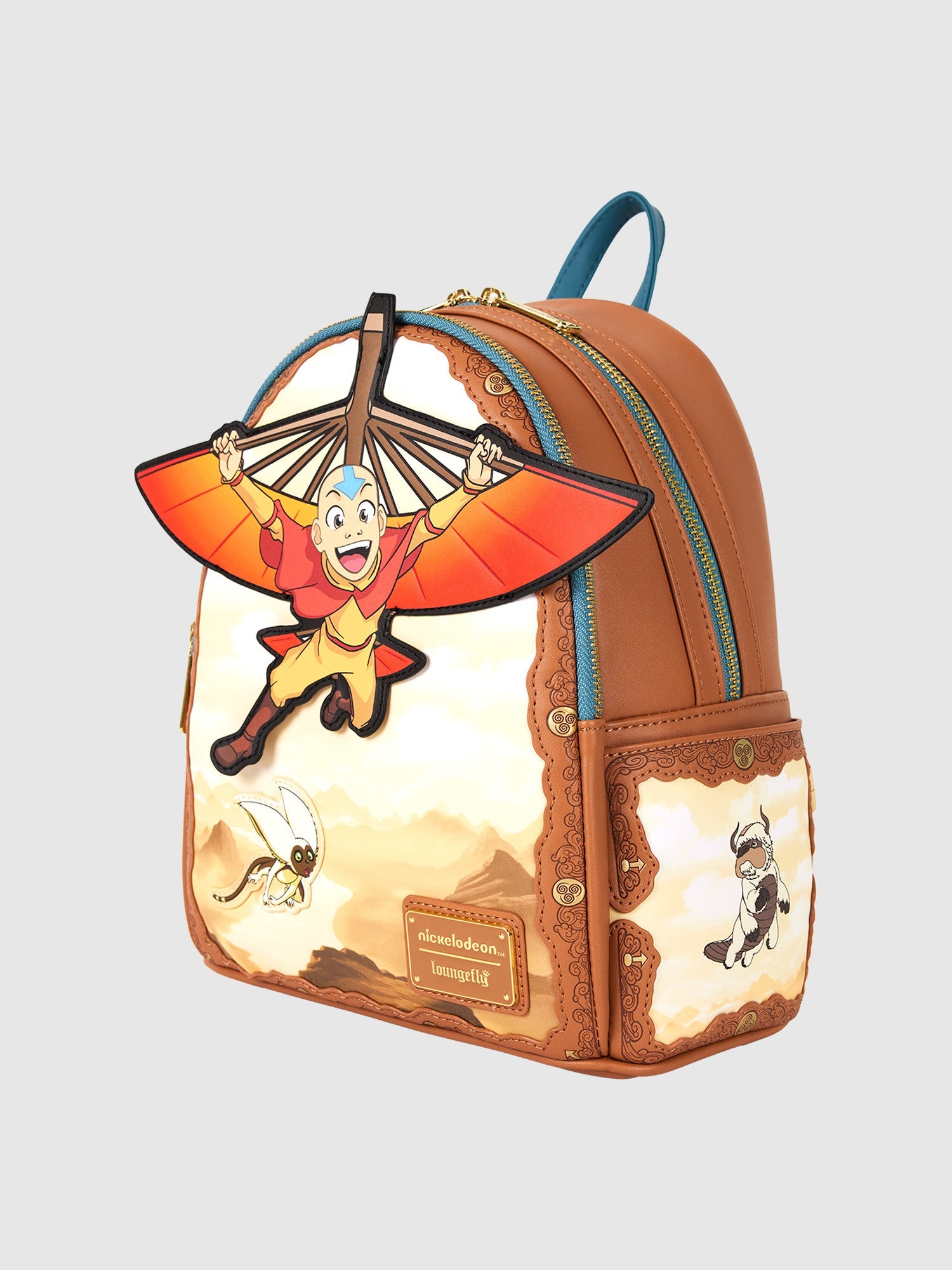 Brave the elements in style! Take along this Avatar: The Last Airbender mini backpack. On the front, you'll find a colorful applique of Aang, flying in his glider, his wings stretched out. Below him, an applique of Momo appears, and a picturesque view of mountains unfolds. The air-bending symbol, along the applique trim on the front, shines in gold-foil detail. Appa appears on the side panels, and when you flip the backpack around, Momo makes an encore appearance as a print. Pack just what you need for a day of soaring through adventures.
