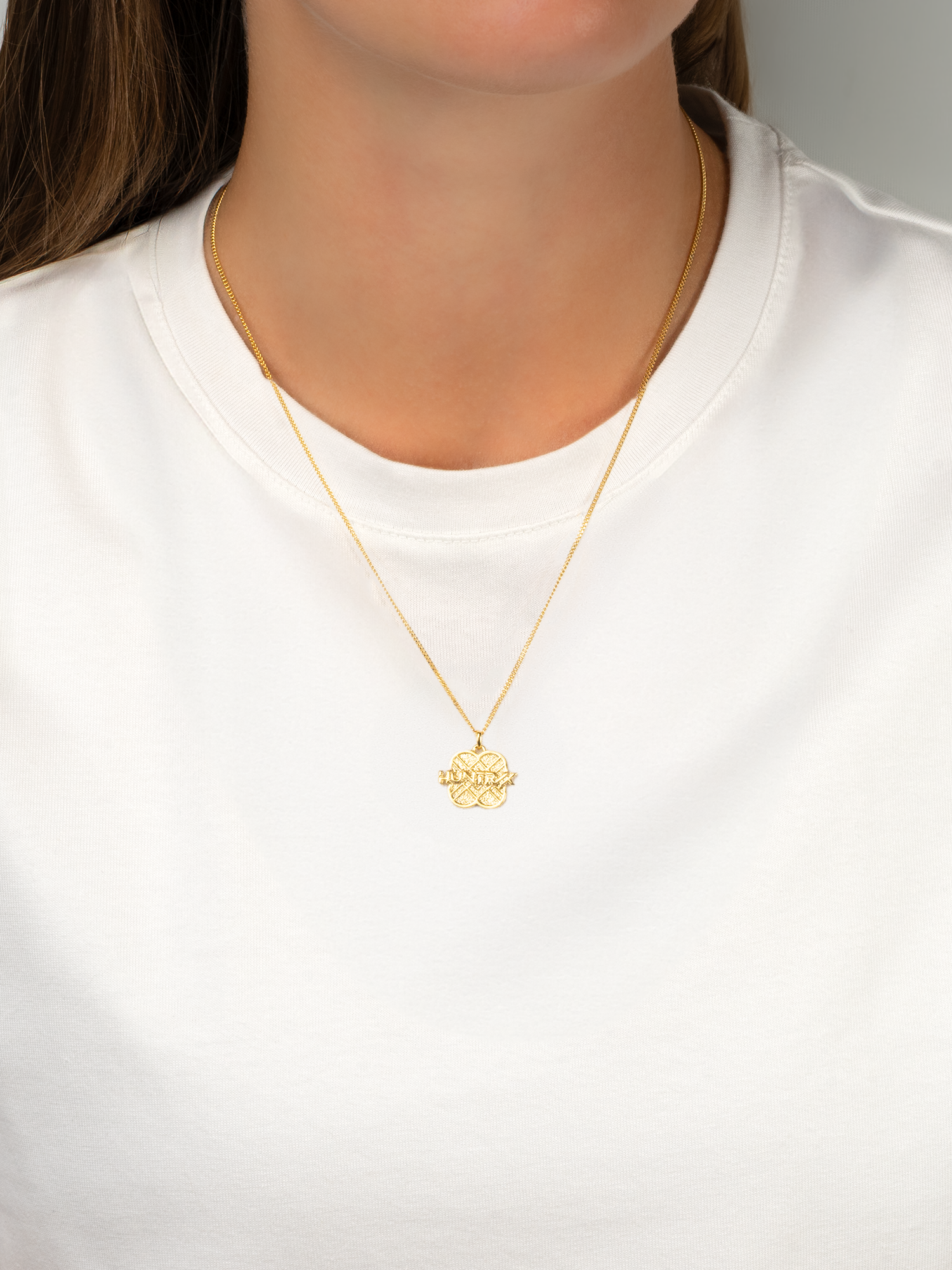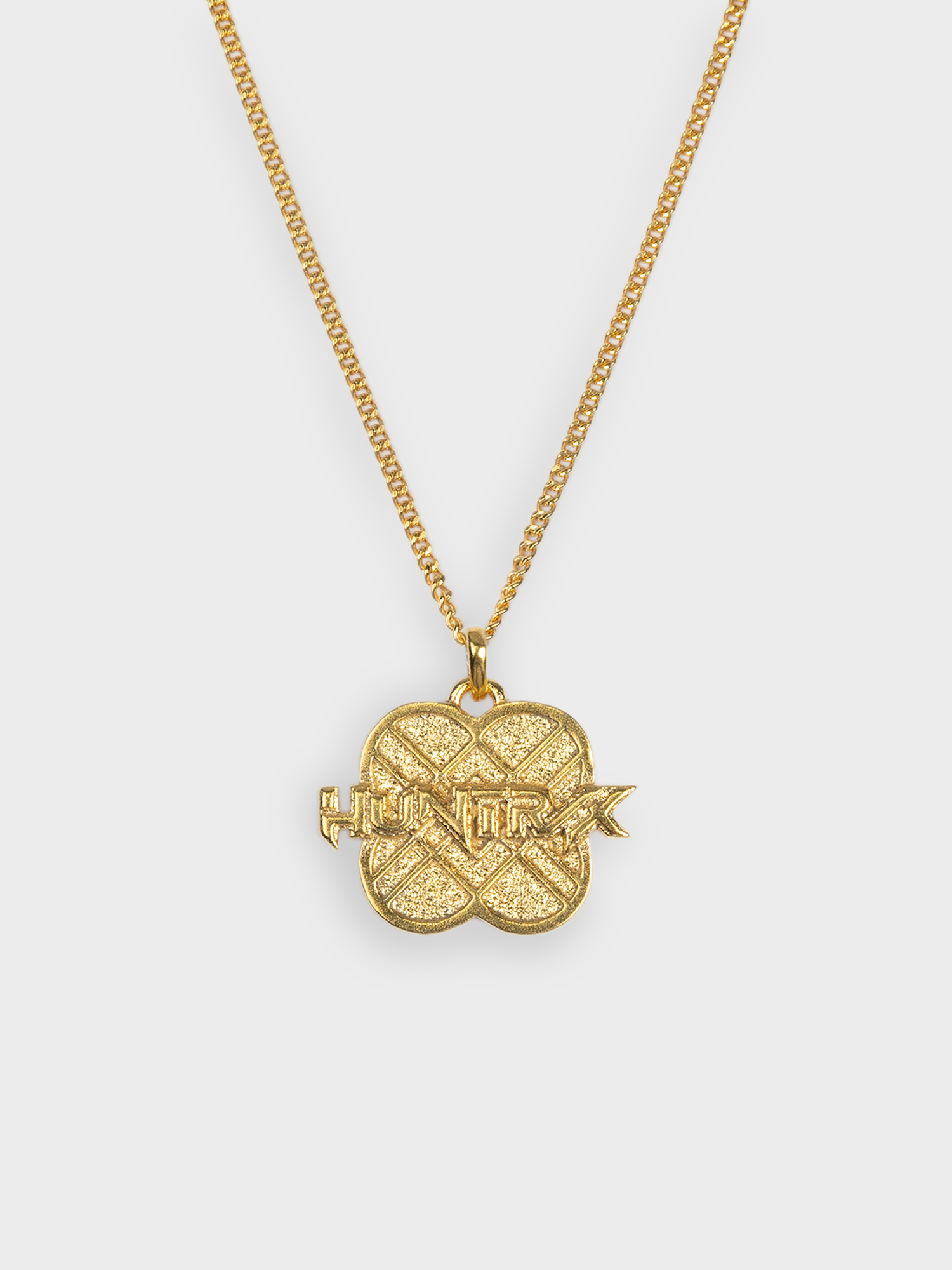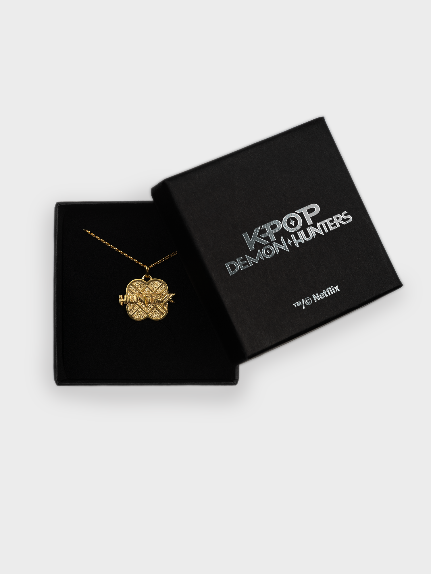 Shine as bright as the Honmoon with this stunning HUNTR/X Necklace. This golden-toned necklace features the iconic Huntrix logo, a subtle nod to their chart-topping "Golden" song that instantly captivated the world. It's the perfect way to carry a piece of their power and harmony with you, whether you're battling demons or just living your best fan life and listening to their latest hit on repeat.