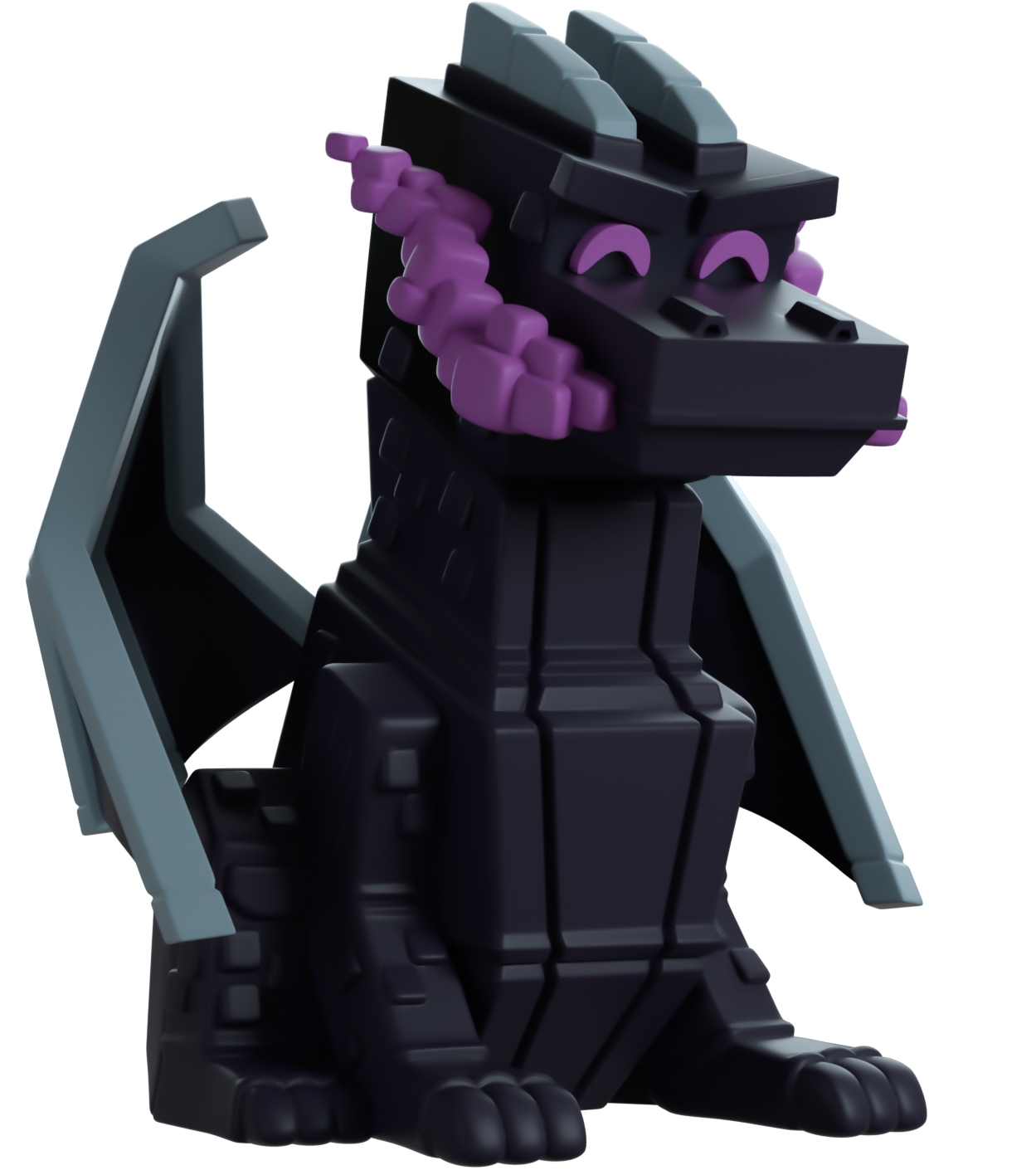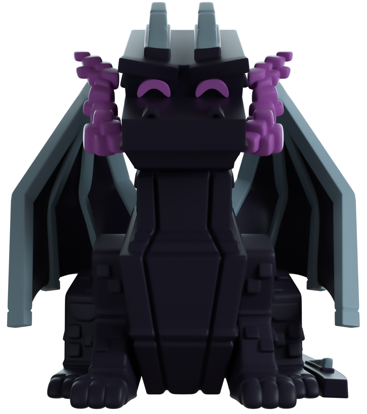 Sitting at 4.2 inches tall with clouds of purple smoke pluming from their closed mouth, two grey horns sit above furrowed glowing eyes as spines run down their long back and onto a curling tail. With two pointed wings extending from their back and curing around their sides, all four legs are planted solidly on the ground as their body is covered in small scales. The exterior of their packaging sees the Ender Dragon readying to unleash a fearsome beam from its mouth. While the interior is a deep purple sky over a light soul stone world, this then continues onto the protective sleeve as their figure can be seen through the large clear window at the packaging's front. This collectible ships in a matte, embossed, protective outer sleeve and a custom-sized plastic protector for maximum protection during shipping.