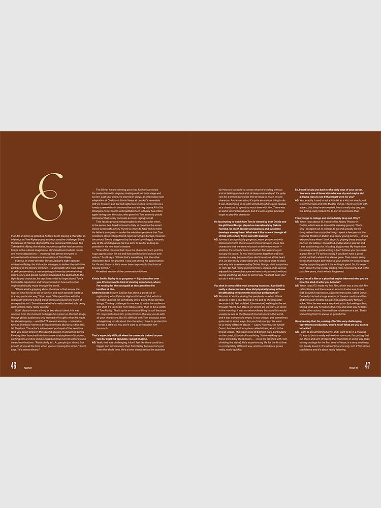 Queue's Issue Seventeen cover features Andrew Scott, star of Netflix series RIPLEY. Photo by Ryan Pfluger