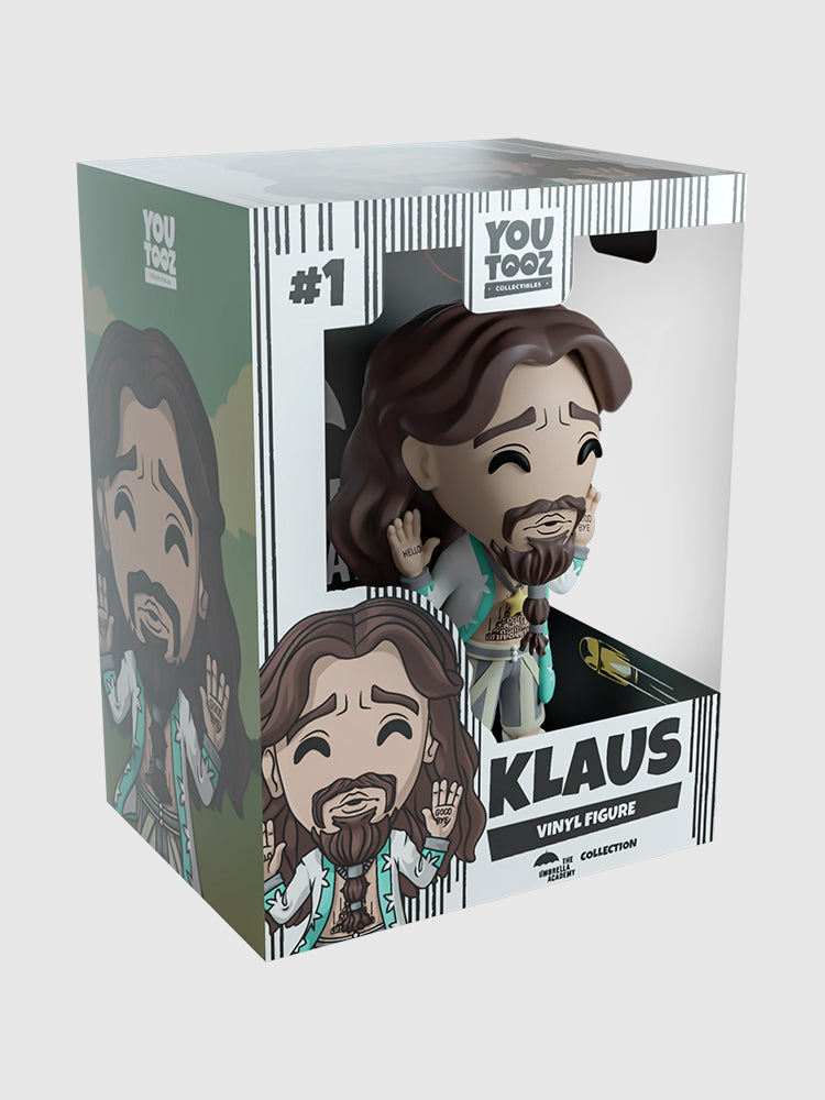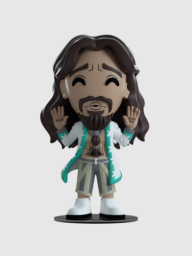"First of all, it's not a cult" Now, we KNOW it's not a cult, but when Klaus strolled into Youtooz for his debut, we couldn't help but join him! Standing at 4.4 inches tall with his hands raised showing off the 'Hello' and 'Good Bye' tattoos on his palms, his face flashes with a look of concern as a thick moustache sits above his mouth and a long goatee hangs down in front of a bare chest and tattooed stomach. With a mane of flowing brown hair that falls down past his shoulders, he wears an open billowing white coat with a pale green trim, striped grey and beige pants and white boots. The exterior of his packaging sees a slightly overwhelmed Klaus being praised by his 'not a cult'. While the interior of his packaging is a stark black covered in red and white flying bullets, knives, umbrellas and crosshairs which continues onto the protective sleeve where his figure can be seen through the large clear window at the packaging's front.